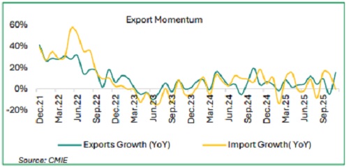 * Merchandise exports have witnessed notable volatility on a MoM basis, bringing uncertainty in the short-term, while broadly remaining resilient despite tariff challenges. Services exports continue steady growth, which, combined with subdued oil prices, will act as a cushion for the current account deficit.