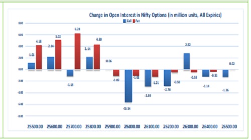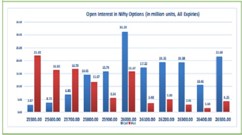 Highest OI build-up is seen at 26000 strike Calls and 25500 strike Puts, to the tune of 31.29mn and 21.82mn respectively.