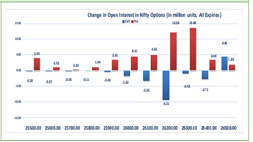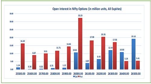 Highest OI build-up is seen at 26500 strike Calls and 26000 strike Puts, to the tune of 19.16mn and 32.23mn respectively.