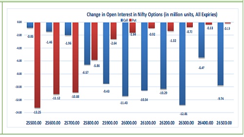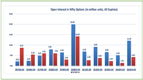 Highest OI build-up is seen at 26000 strike Calls and 26000 strike Puts, to the tune of 19.86mn and 14.03mn respectively
