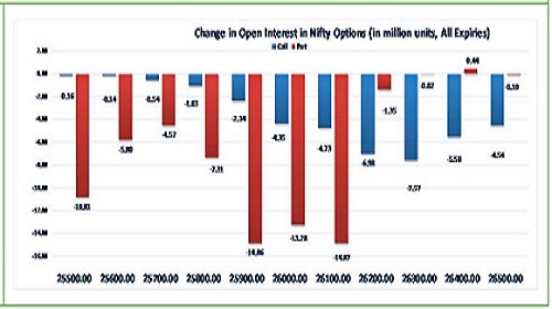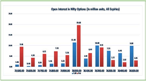 * Highest OI build-up is seen at 26000 strike Calls and 26000 strike Puts, to the tune of 11.48mn and 19.68mn respectively