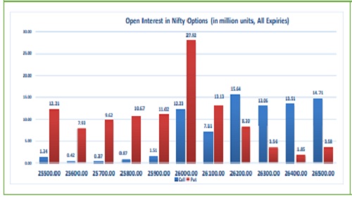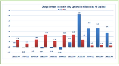 Highest OI build-up is seen at 26200 strike Calls and 26000 strike Puts, to the tune of 15.64mn and 27.92mn respectively.