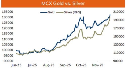 * Spot Gold is likely to trade higher amid weakness in the US dollar and safe haven buying. Prices would get support on growing bets that the US President would appoint a dovish fed chair in early 2026, which could turn out to be negative for the dollar and support the bullions to hold its gains. Further, concerns over US labor market and growing expectation of more rate cuts in the coming year will also boost the yellow metal to make new highs. As per the CME Fed-watch tool January rate cut has gone up to 24.4% from 20.6% a day ago. Furthermore, strong central bank buying and investment inflows would again strengthen the bullions.
