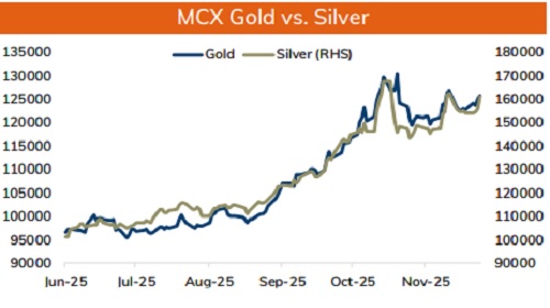* Spot Gold is likely to trade with the positive bias and rise towards $4200 level on weak dollar and decline in US treasury yields across curve. Further, prices may rally as soft economic data followed by dovish comments from Fed officials bolstered expectation of another rate cut in December meeting. As per CME FedWatch tool traders are now pricing almost 85% chance of a rate cut in December, up from 30% a week ago. Moreover, prices may rally on strong central bank demand for gold and as the concern over Fed independence resurfaced after White House National Economic Council Director Kevin Hassett emerged as the front-runner to serve as the next Fed chair. Possibility of Hassett being nominated put rate cuts back on the table