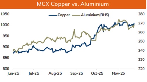 * Copper prices are expected to trade with a positive bias amid weak dollar, outflows to U.S. stocks and optimistic global market sentiments. Further, prices may rally on growing prospects of a December U.S rate cut following dovish signals from central bank officials and softer than expected economic data from U.S. Moreover, prices may move north on supply concerns. Chilean copper producer Codelco offered to supply some Chinese buyers at a premium of US$350 per ton over LME prices for 2026 annual contracts, reflecting tightness in copper market