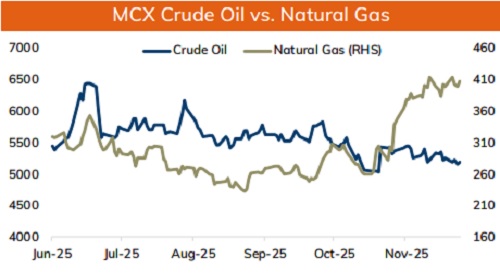 * Crude oil is likely to trade with negative bias and dip towards $57.30 level on rising crude oil inventories, prospects of oversupply and signs of positive progress in peace talk between Ukraine and Russia. Investors are of opinion that a peace deal may increase the chances of lifting sanctions on Russian crude exports adding more supply at a time of expectation of supply glut next year. As per EIA data U.S. crude inventories climbed by 2.8 million barrels to 426.9 million barrels last week. Inventories of fuel also rose, with gasoline and distillate up by 2.5 million barrels and 1.1 million barrels respectively. Meanwhile, sharp downside may be cushioned on weak dollar and rise in risk appetite in the global markets. Additionally, OPEC+ is likely to leave output levels unchanged at its meeting on Sunday
