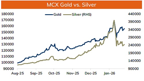 * Spot Gold is likely to trade with positive bias amid weak dollar and decline in US treasury yields. Further, softer than expected inflation data from US reinforced expectation that US Federal Reserve would deliver at least two rate cuts in 2026. U.S. rate futures priced in about 63 bps of easing this year. Additionally, prices may rally on safe haven demand following escalating geopolitical tension in Middle East and Eastern Europe. Further, gold demand from China stayed strong ahead of Lunar New Year. Moreover, market anticipates that foreign investors will reroute their dollar assets into precious metal after Bloomberg reported that Chinese regulators have advised financial institutions to curb holdings of U.S. Treasuries because of concerns over concentration risks.