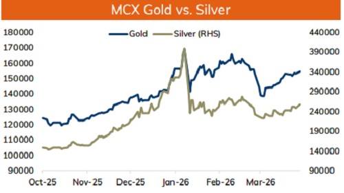 * Spot Gold is likely to face resistance near $4850 level and slip back towards $4700 level amid firm dollar and rise in US treasury yields. Further, prices may slip as renewed tension in Middle East and shaky prospect of peace deal between US and Iran, refueled concerns over rising inflation and monetary tightening across major economies. Strait of Hormuz had been closed again, less than 24hrs after it was reopened. US has sized an Iranian cargo ship that tried to run its blockade and President Doanld Trump has warned that US may hit infrastructure in Iran if Tehran does not make a deal. Meanwhile, sharp downside may be cushioned on renewed concerns over Fed independence after Trump threatened again to fire Fed Chair Powell. Traders will keep an eye on whether Kevin Warsh will be confirmed by the Senate to lead Fed, as he faces a confirmation hearing on April 21. MCX Gold June is expected to face stiff resistance near Rs.155,500 level and slip towards Rs.151,000- Rs.149,000 level.
