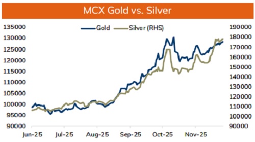 * Spot Gold is likely to hold its gain and trade with the positive bias towards $4250 level on weak dollar and strong investment demand. Further, prices may rally amid growing probability of December rate cut. As per CME Fed-Watch tool traders are now pricing almost 86% chance of a rate cut in December and two mare rate cuts in the coming year. Additionally, concern over Fed independence resurfaced after White House National Economic Council Director Kevin Hassett emerged as the front-runner to serve as the next Fed chair. Furthermore, prices would get support on addition of fresh net longs in the latest CFTC report to 204.7k from 176.6k.