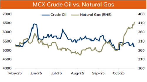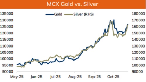 • Spot Gold is likely to correct further towards $4120 level amid rise in US treasury yields. Further, investors bet on rate cut in December meeting took a dive after hawkish comments from Fed officials. Boston Fed President Susan Collins, Cleveland Fed President Beth Hammack, and St. Louis Fed President Alberto Musalem all said they favored keeping interest rates steady. As per CME FedWatch tool traders are now pricing a 50.7% chance of a rate cut in December, down from about 62.9% a day ago. Meanwhile, sharp fall in the prices may be cushioned on strong central bank demand for gold and as the concern over Fed independence resurfaced.