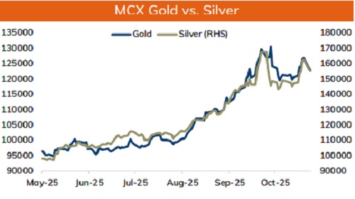 * Spot Gold is likely to move further south towards $3980 level amid strong dollar and rise in US treasury yields across curve. Further, prices may slip as increasing number of Fed policymakers have maintained hawkish stance on policy, dimming hopes for December rate cut. Additionally, investors fear that longest government shutdown has created gaps in economic data and it will take time to gather and publish it. They are also worried over the quality of releases. As per CME FedWatch tool traders are now pricing a 42% chance of a rate cut in December, down from about 62% a week ago.