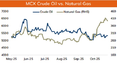 * Crude oil is likely to trade with negative bias and slip towards $58.50 amid strong dollar and risk aversion in the global markets. Further, disappointing economic data from China has raised concerns over demand outlook. Moreover, investors will remain cautious ahead of slew of economic data from US that was delayed during the government shutdown and it is expected to provide clues on the health of the economy. Additionally, prices may slip as concerns over supply disruption from Russia's key oil export port of Novorossiysk eased as loadings resumed. Furthermore, concerns about global oversupply would weigh on looming sanctions against Russia’s Lukoil. In addition, hawkish comments from US Fed officials fade hopes for another rate cut in December meeting