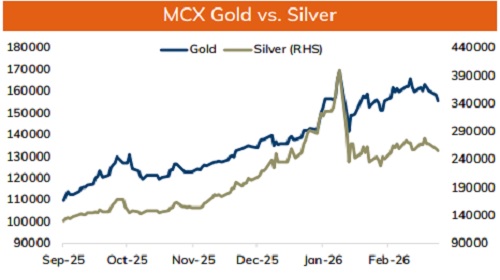 * Spot gold is expected to hold its ground near $4950 and bounce back towards $5150 amid safe haven buying. Escalating conflict between US and Iran would support the bullions to rebound from its 3-week lows. Meanwhile, inflation concerns due to rising crude oil prices could delay Fed’s interest rate cut and limit upside in prices. This week US central bank is expected to hold its rates steady, whereas focus will also remain on other central banks policy decisions. At the same time investors will monitor developments from Middle east to get more cues.