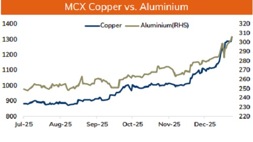 • Copper prices are expected to trade with a positive bias on weak dollar and optimistic global market sentiments. Further, prices may rally as weaker than expected economic data from US and dovish comments from Fed officials have reinforced expectations that the Fed will cut more than 1 rate cut in 2026. Moreover, prices may move north on supply concerns amid series of mine disruption and recurring protest. Additionally, projections for market deficit and low stock levels in LME registered warehouses would support prices