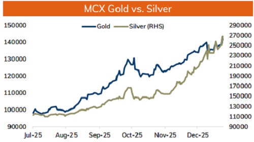 * Spot Gold is likely to trade with the positive bias and rise further towards $4650 level on weak dollar and softening of US treasury yields. Further, demand for safe haven may increase as geopolitical tensions remained elevated due to unrest in Iran, escalation in fighting between Russia and Ukraine and US renewed signals over taking control of Greenland after capture of Venezuela's President Nicolas Maduro. Moreover, prices may rally on concerns over Fed independence. Additionally, Fed is expected to hold rates steady at its January meeting but market is pricing 2 more rate cuts this year. Further, uncertainty over tariffs persist as Supreme Court deferred on the legality of President Trump’s tariffs.