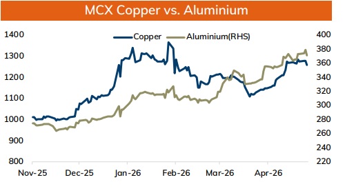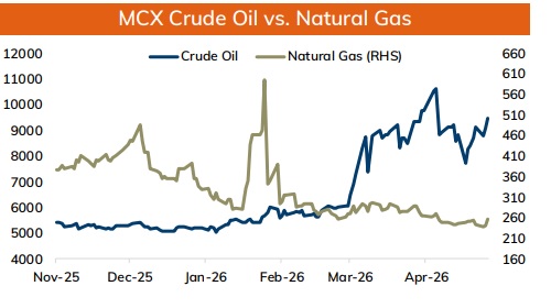 * NYMEX Crude oil is likely to trade with positive bias on lingering concerns over supply constraint due to blockade of Strait of Hormuz. Further, hopes of diplomatic breakthrough is fading as efforts to revive talks stalled and both nations shows little sign of softening. US officials said President Donald Trump is not happy with the latest proposal from Iran to end the war, dashing hopes for quick end to conflict. Additionally, prices may rally as shipping activity through the Strait of Hormuz, remained limited, significant disruption in region. Moreover, Ukrainian drone attack led to major blaze at Russia’s Tuapse refinery, which has annual production capacity of 240,000 bpd. Meanwhile, UAE announced that it may leave OPEC and OPEC+ by 1 st may weakening groups control over global oil supplies and allowing UAE to increase output once exports resumes from Gulf. MCX Crude oil May is likely to rise towards Rs.9700-Rs.9850 level as long as it stays above Rs.9100 level.