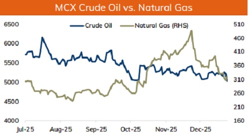 * NYMEX Crude oil is likely to trade with negative bias and slip further towards $55.5 level on strong dollar and pessimistic global market sentiments. Further, prices may move south as US President Donald Trump’s plan to refine and sell Venezuelan crude oil raised concerns about the long-term impact of the U.S. actions. Investors fear that if the oil from Venezuela flows into the market sustainably then it could add supply to an already oversupplied market. Moreover, EIA data showed rise in gasoline and distillate stockpiles, signaling weak fuel demand. While, crude oil inventories decreased by about 3.8M barrels for the week ending 2 nd January 2026