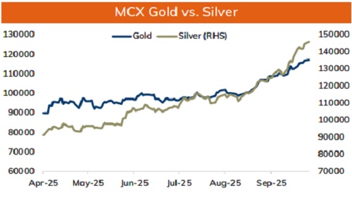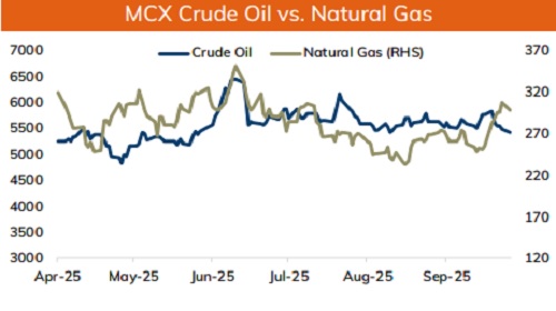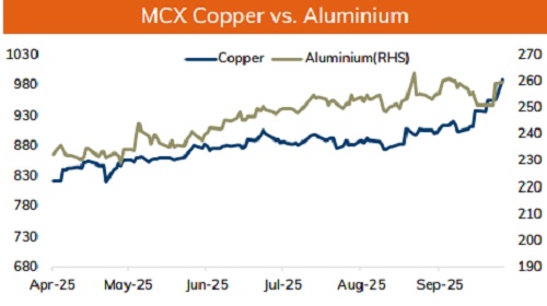 • Copper prices are expected to trade with a positive bias amid supply concerns from Chile and Indonesia. In its latest statement the Grasberg mine has lowered its annual supply by 3% and expect that the mine will return to full capacity after 2027. Further, drop is Chile’s production in August almost by 10% YoY would likely to weigh on supply concerns. Prices would also get support amid soft dollar and growing bets of further monetary policy easing from the US Fed. Meanwhile, US government shutdowns and National Day holiday in China may check its upside.