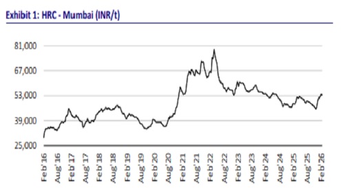 * HRC monthly average prices surged INR4,600/t MoM to INR51,400/t, supported by definitive safeguard duty, higher raw material costs and lower imports. Monthly average rebar (BF-route) prices increased INR5,600/t MoM to INR53,500/t in Jan’26 amid strong domestic demand.