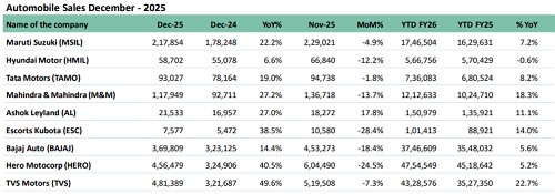In the month of December, auto dispatches normalized seasonally after festive highs, falling 14% MoM, but grew 32% YoY, with positive growth across all segments. PV volumes declined 3% MoM but rose 25% YoY, led by MSIL, supported by sustained Mini and Compact demand; notably, MSIL was the only OEM to post sequential growth amid broad-based softness. CV volumes strengthened 14% MoM and 25% YoY, reaching the highest level of the fiscal, led by TAMO on strong truck dispatches, while AL's bus volumes grew 30% MoM, reflecting continued strength in state transport orders. 2W volumes declined 17% MoM but grew 35% YoY, led by TVS, supported by leadership in EVs and balanced premium-commuter mix; HERO stood out on exports with 10% MoM growth despite domestic normalization. Tractor volumes corrected 28% MoM but rose 39% YoY, led by M&M, underpinned by strong agri cash flows, healthy reservoirs, and higher Rabi sowing, while ESC's exports rose 64% MoM, providing incremental support.