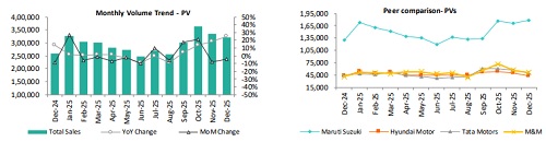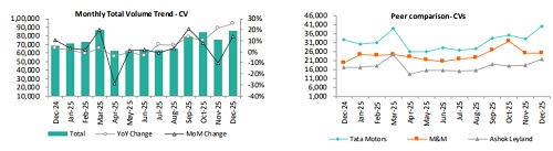 The CV segment reported a 14% MoM and 25% YoY increase in December, reaching the highest monthly volumes of the current fiscal, supported by sustained government-led infrastructure spending, healthy freight movement, and replacement demand following the festive season. Demand remained resilient amid stable economic activity and improved fleet utilisation. Trucks, accounting for 64% of CV volumes, recorded a 16% MoM and 34% YoY increase, with M&M leading the growth. LCVs, which contribute 20% of volumes, posted a 10% MoM and 28% YoY rise, driven primarily by TAMO. The Bus segment reported a 27% MoM and 12% YoY increase, with TAMO leading sequential growth and AL driving growth on an annual basis.