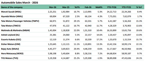 Auto dispatches increased 3% MoM and 16% YoY in March, with broad-based domestic growth, while exports grew 20% YoY but declined 8% MoM with ~21% mix. 2Ws led the growth, supported by rural demand recovery and fiscal-end push, while PVs saw stable traction with MSIL, M&M and TMPV contributing. CVs improved across segments with TMCV, AL and EIM driving volumes, particularly in trucks and buses. Tractor demand remained strong domestically due to seasonal tailwinds, even as exports lagged. Despite the typical March boost, FY26 performance was marked by better demand consistency, especially in 2Ws, alongside steady gains in PVs and CVs, suggesting a more durable recovery compared to the volatility seen in previous periods.