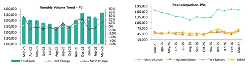 Domestic PV dispatches rose 3% MoM and 15% YoY, with broad-based growth across OEMs, supported by festive demand, year-end dealer push and targeted discounting, particularly in EVs by M&M and TMPV. MSIL led volume growth, while HMIL retained its fourth position. Export volumes increased 15% MoM and 27% YoY, again led by MSIL. For FY26, PV volumes grew 7% YoY, driven primarily by M&M, supported by its SUV portfolio and incremental contribution from new launches such as BE6, XEV9e and 9S.