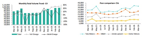 CV dispatches rose 13% MoM and 11% YoY, with growth led by TMCV across both domestic and export markets. Trucks, contributing 65% of volumes, grew 11% MoM and 14% YoY, with EIM posting the fastest growth while M&M saw the highest incremental contribution. LCVs (18% mix) increased 9% MoM and 11% YoY, driven by TMCV. Domestic buses (14% mix) rose 48% MoM and 5% YoY, albeit on a lower base, with TMCV leading. For FY26, industry volumes grew ~10% YoY across most OEMs, with AL lagging but broadly in line.