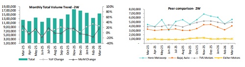 March volumes rose 3% MoM and 16% YoY, supported potentially by rural recovery, fiscal-end push, festive activities and some discounting on key models. E2W demand picked up ahead of subsidy cuts, with TVS/BAJAJ/HERO at 49.3k/46.2k/21.4k units, up 60%/ 31%/167% YoY. For FY26, growth was driven by steady improvement in monthly volumes rather than one-off events. Volumes stayed largely above ~9.5 lakh/month, with fewer weak months, showing better demand consistency. TVS led growth with strong domestic volumes and matching export traction, while BAJAJ and HERO saw stable growth. Overall, trends indicate gradual demand recovery rather than festival-led spikes.