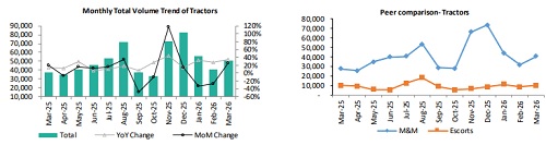 Domestic tractor dispatches rose 23% YoY, driven by harvest season activity in northern India and the full-month Chaitra Navratri festival, with FY-end channel stocking supporting a 29% MoM increase. Seasonal factors, including improved rabi crop outlook and reservoir levels, contributed to sustained farmer demand. In contrast, exports accounted for 4% of total volumes, declining 16% MoM and 26% YoY across the industry, reflecting subdued overseas orders and a higher domestic focus. Overall, domestic strength offset weak export trends, with monthly sequential gains largely supported by timing of festival demand and channel inventory adjustments.