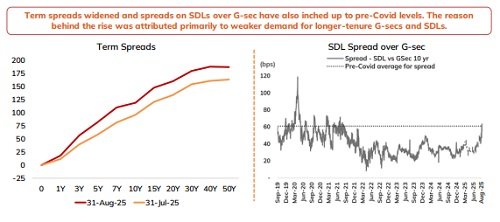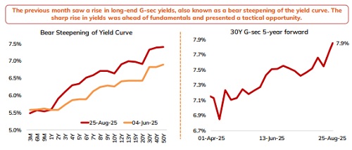Contrarily, bond yields have risen by 30–50 bps across the curve, with long-duration G-Secs bearing the brunt i.e. a bear steepening in the G-sec yields curve. We attribute this move less to fundamentals and more to market sentiments, driven by evolving fiscal expectations and shifting regulatory dynamics. The resulting steepening of the G-Sec yield curve presents a compelling tactical entry point for investors.