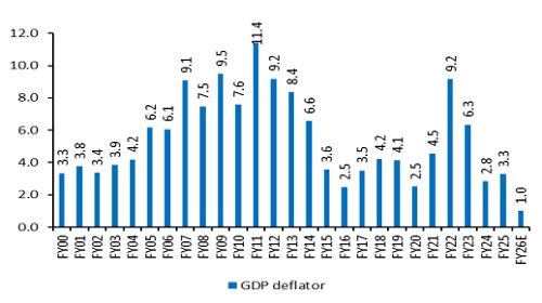 Recent GDP data highlights the contrast between real growth, which remains materially above forecast with Q1 FY26 at 7.8%, Q2 FY26 at 8.2% and H1 nominal growth at below 8.7% y-o-y. While the transmission of policy rates, lower tax rates, potential easing of tariff pressures and regulatory easing should enable growth pick-up, near-term challenges on government revenues, corporate revenues and earnings could be evident going forward. The GDP deflator (a proxy for aggregate inflation in economy) currently at its historical low, also sits at odds with a more realistic measure of economy-wide prices.