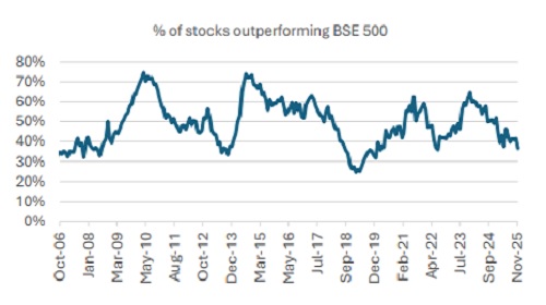 Indian equities did well for the month with the Nifty and the Sensex returning 2% and 2.2% respectively in November. The performance down the market capitalization curve was weaker with Nifty Midcap 150 and Nifty Smallcap 250 returning 1.7% and -3.3% respectively. On a YTD basis, Nifty and Sensex have returned 12.4% and 11.2% respectively as against 6.8% and -5% respectively for Nifty Midcap 150 and Nifty Smallcap 250 indices. Performance beneath the surface suggests a more pronounced deterioration in market breadth. In the BSE 500 universe, two-thirds of the stocks have underperformed the index on rolling 12-month returns. Given that large caps stay cheaper than broader markets on relative valuations, we believe polarization in equity markets may continue to increase.