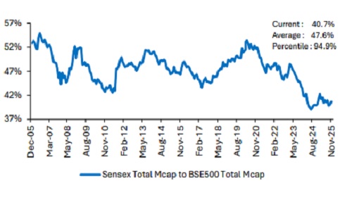 The interesting aspect is that earnings expectations have continued to improve with number of stocks being upgraded nearing the number being downgraded now versus a skew significantly in favour of downgrades over the past few months. Improving consumer sentiment on the back of Income Tax and Goods and Services Tax cuts as well as falling inflation, transmission of policy rate cuts and government’s willingness to push through structural reforms such as the recent labour codes augur well for economic and earnings outlook going forward. On the other hand, however, cyclical headwinds from trade uncertainties and the government’s fiscal capacity constraints pose risks to growth. Overall, earnings and economic growth remain weak, but the worst appears to be behind, and we expect a gradual, directional improvement going forward.
