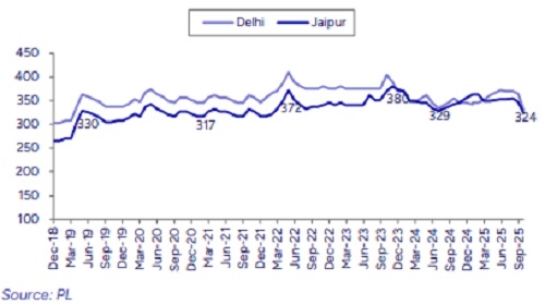 In Delhi, cement prices have corrected by about Rs.25-30/bag following the GST rate rationalisation. Companies are fully passing on the benefits to customers. Demand remained slow through September due to rains and worker unavailability, though some improvement has been seen post-Shradh and following the implementation of the new GST rates. Dealers do not expect any price hikes in the near term and believe meaningful demand revival will only take place after Diwali.