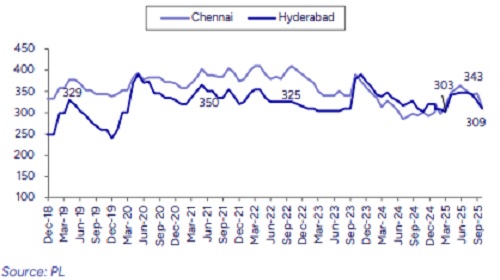 In Chennai, cement demand is currently stable to moderate, with dealers anticipating a pickup from October onwards. They expect upcoming electionrelated spending to support infrastructure and construction activity in the state, thereby boosting consumption. The ~Rs.30/bag price reduction following the GST cut has largely been absorbed, and dealers believe prices are unlikely to move higher until a few months of sustained demand recovery are seen.