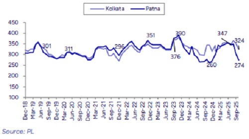 In Patna, cement demand remains subdued due to the monsoon and ongoing festive season. However, dealers expect gradual improvement, supported by GST rationalization, with a potential price hike likely towards the end of Q3 (December) as demand strengthens. They highlighted that the revised post-GST prices are still being integrated into the system—while some dealers have adopted the new rates, others remain uncertain and continue to sell small quantities at the older prices.