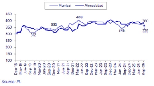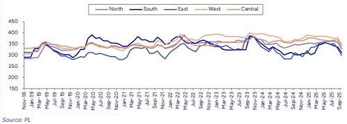 We interacted with cement dealers across regions in India to assess demand and pricing trends in Sep’25. Our discussions indicate that demand remained weak across most markets, impacted by rains, labor shortages, and ongoing festive activities. Prices largely reflect GST-related adjustments, with companies passing on the full benefits to customers. The Western and Central regions saw stable markets, while the Eastern region remained subdued with limited offtake due to intense weather. In the Southern region, demand showed gradual recovery in Chennai, whereas Hyderabad continued to witness weak offtake. Northern markets saw some improvement recently, but overall demand is expected to pick up meaningfully only post Diwali. The all-India average selling price declined by Rs29 MoM to ~Rs325/bag. Going forward, dealers across regions expect a meaningful recovery only after Diwali.
