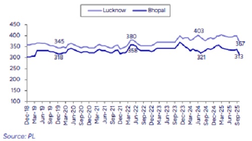 In Bhopal, dealers indicated that companies are largely passing on the full GST benefits, with billing prices reduced accordingly. Demand was weak through September as many buyers delayed work in anticipation of GST implementation, while rains and labor shortages (with workers engaged in harvesting Rabi crops) further impacted activity. Since GST came into effect, demand has recovered and piled-up inventory has cleared up, leading to healthy sales. Dealers expect demand to remain decent through the first half of October, though activity may soften temporarily as laborers return home for festivals. A meaningful recovery is anticipated in November once the festive season concludes, with dealers expecting demand to be much stronger compared to recent months.