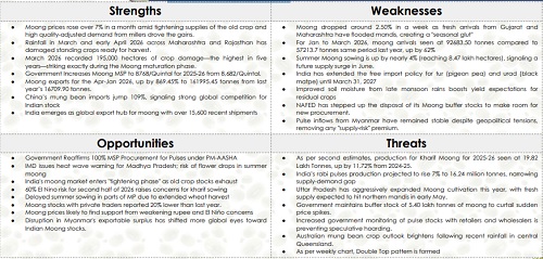 Global and Weather Risks: Global and weather factors introduce volatility. China’s mung bean imports rose 109%, intensifying competition, while improved Australian crop outlook adds supply. Conversely, heatwave risks and 60% El Niño probability threaten yields. Early sowing declined 2.9% to 0.95 lakh hectares, indicating potential tightening ahead despite current ample supply conditions.