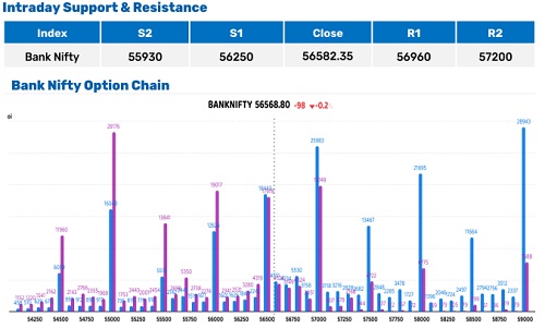 * Heavy OI build - up at 57,000 (both Call and Put) marks it as the key level