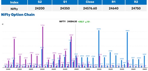 * In-the - money call writers have reduced positions and shifted exposures to higher strikes, reflecting improving bullish sentiment. Immediate resistance is seen at 24,700, where call writing remains active; a sustained move above this level could open the path for further upside.