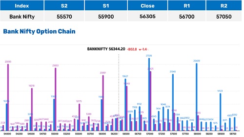 * Put writing is visible at the 56,000 strike, which will act as key support; a breach below this may trigger sharp downside.