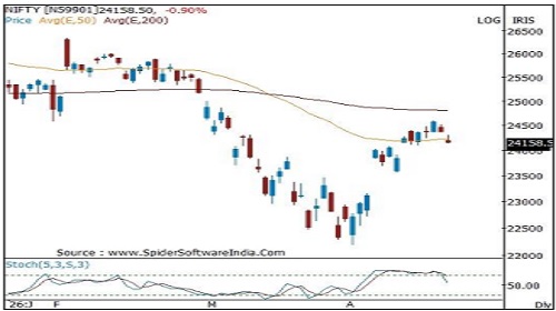 Nifty in the last two sessions witnessed profit booking after rallying more than 2400 points in just 3 weeks which has pushed the daily and weekly stochastic oscillators into overbought territory . Nifty has reacted lower from the key resistance area of 24 ,650 - 24 ,800 being the confluence of the previous breakdown area, 200 days EMA and the 61.8% retracement of the entire decline 26 ,373 to 22 ,183.