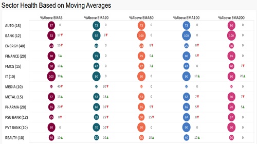 This chart provides a sector-wise distribution of stocks that are trading above specific Exponential Moving Averages (EMAs). EMAs are commonly used indicators that give more weight to the most recent prices, making them more responsive to new information. The chart includes the 5-, 20-, 50-, 100-, and 200-day EMAs.