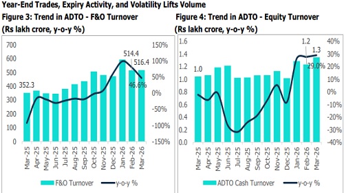* As of March 2026, ADTO across F&O and equity stood at Rs 517.7 lakh crore, recording a 46.5% y-o-y increase. This significant growth is partly due to a low base in March 2025, when trading activity was impacted by regulatory tightening. On a sequential basis, ADTO increased by Rs 2.12 lakh crore in March 2026, primarily due to higher trading activity during the financial year-end, including portfolio adjustments and tax-related.trades. Additionally, the March derivatives expiry (quarter-end) led to increased rollover and unwinding of positions, further boosting volumes. Elevated market volatility, driven in part by global geopolitical tensions, also supported higher trading and hedging activity.