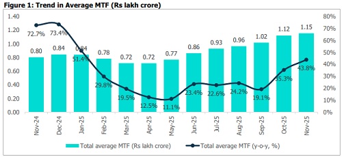 * MTF growth remained robust in November 2025, with the total MTF book increasing by 43.8% annually to Rs 1.15 lakh crore. Although this is lower than the notable 72.7% growth seen a year earlier, it still indicates strong momentum in leveraged trading. The increase was driven by favourable equity market conditions, enhanced broker financing capacity, and greater participation from retail investors.