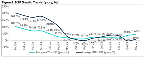 * Conversely, BSE, despite operating on a significantly smaller base, experienced a 2.1% year-on-year contraction in the previous month. This trend reversed in November 2025, when its MTF book increased by 8.9% year-on-year sequentially to Rs 0.03 lakh crore, suggesting a modest recovery.