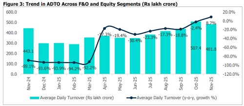 * Throughout the year, MTF exposure has grown steadily, supported by strong market confidence. The National Stock Exchange (NSE) continues to lead this segment, accounting for nearly 97% of total MTF financing. Meanwhile, the Average Daily Turnover (ADTO) increased by 8.73% year-on-year (y-o-y) to Rs 481.8 lakh crore in November 2025, breaking a 12-month decline streak.