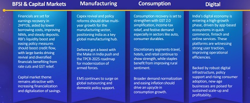 * Structural tailwinds from government reforms such as GST 2.0, income tax reforms and RBI’s liquidity infusion, will lead to robust credit growth & support profitability for BFSI sector.